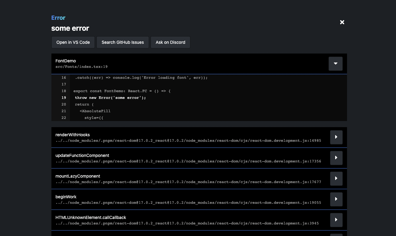 Our custom error overlay has the ability to open the troublesome file in your default editor, and look for similar GitHub issues.